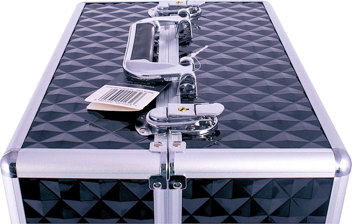 De SUNONE Make Up Koffer Patroon Zwart XL is tweedelig – kan worden gebruikt met alle of slechts één afneembare sectie. In de make up koffer XL Zwart berg je veilig spullen op dankzij twee sloten die de inhoud beveiligen. Aan de make up koffer XL Zwart zijn twee sleutels bevestigd.